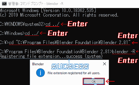 - コマンドプロンプトを管理者として実行します。 Blender.exeの場所に移動します。